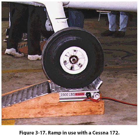 The inclined plane is a simple machine that facilitates the raising or lowering of heavy objects by application of a small force over a relatively long distance. Some familiar examples of the inclined plane are mountain highways and a loading ramp on the back of a moving truck. When weighing a small airplane, like a Cessna 172, an inclined plane (ramp) can be used to get the airplane on the scales by pushing it, rather than jacking it. A ramp can be seen in Figure 3-17, where a