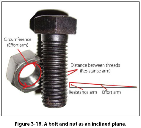 Bolts, screws, and wedges are also examples of devices that operate on the principle of the inclined plane. A bolt, for example, has a spiral thread that runs around its circumference. As the thread winds around the bolt’s circumference, it moves a vertical distance equal to the space between the threads. The circumference of the bolt is the effort arm and the distance between the threads is the resistance arm. [Figure 3-18] Based on this analysis, it can be seen that a fine threaded bolt (more threads per inch) has a greater mechanical advantage than a coarse threaded bolt.