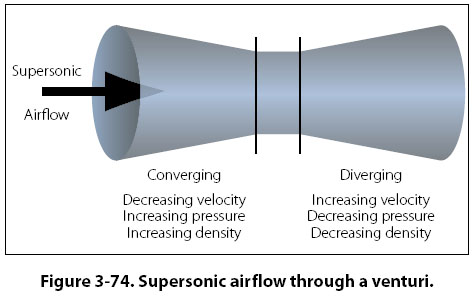 High-Speed Aerodynamics Compressibility Effects When air is flowing at subsonic speed, it acts like an incompressible fluid. As discussed earlier in this chapter, when air at subsonic speed flows through a diverging shaped passage, the velocity decreases and the static pressure rises, but the density of the air does not change. In a converging shaped passage, subsonic air speeds up and its static pressure decreases. When supersonic air flows through a converging passage, its velocity decreases and its pressure and density both increase. [Figure 3-74] At supersonic flow, air acts like a compressible fluid. Because air behaves differently