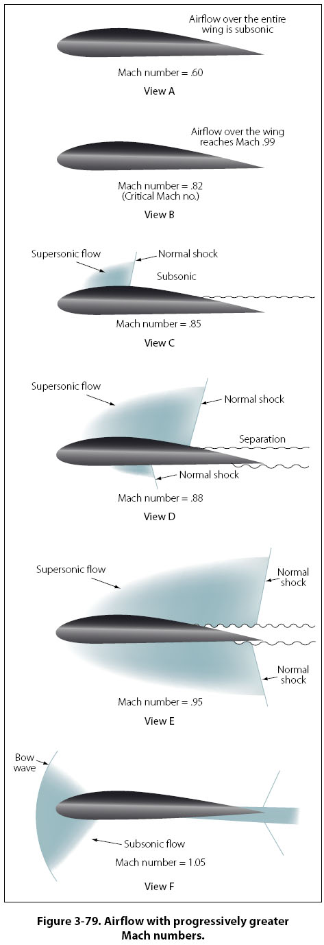 If an airplane designed to fly subsonic, perhaps at a Mach number of 0.80, flies too fast and enters transonic flight, some noticeable changes will take place with respect to the airflow over the wing. Figure 3-79 shows six views of a wing, with each view showing the Mach number getting higher. The scenario for the six views is as follows: