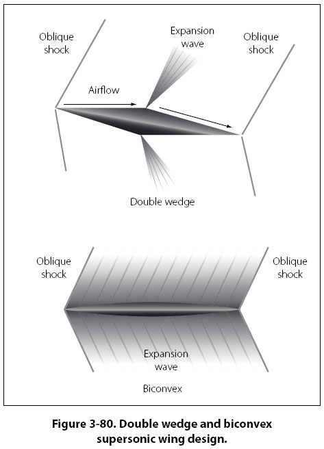 The airfoil shown in Figure 3-79 is not properly designed to handle supersonic airflow. The bow wave in front of the wing leading edge of view F would be attached to the leading edge, if the wing was a double wedge or biconvex design. These two wing designs are shown in Figure 3-80.