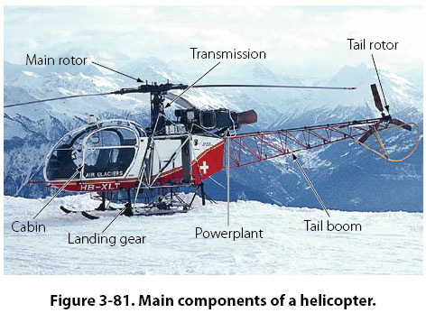 Helicopter Aerodynamics The helicopter, as we know it today, falls under the classification known as rotorcraft. Rotorcraft are also known as rotary wing aircraft, because instead of their wing being fixed like it is on an airplane, the wing rotates. The rotating wing of a rotorcraft can be thought of as a lift producing device, like the wing of an airplane, or as a thrust producing device, like the propeller on a piston engine. Helicopter Structures and Airfoils The main parts that make up a helicopter are the cabin, landing gear, tail boom, powerplant, transmission, main rotor, and tail rotor. [Figure 3-81]