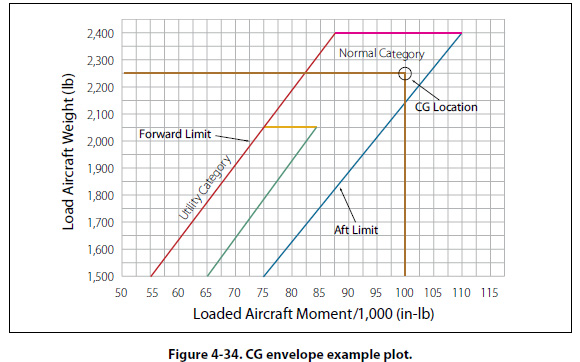 The total loaded weight of the airplane is 2,258 pounds and the total loaded moment is 99,400 in-lb. These two numbers can now be plotted on the CG envelope to see if the airplane is within CG limits. Figure 4-34 shows the CG envelope, with the loaded weight and moment of the airplane plotted. The CG location shown falls