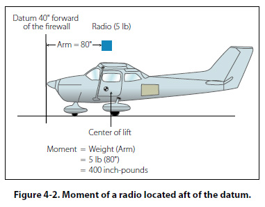 Moment A moment is the product of a weight multiplied by its arm. The moment for a piece of equipment is in fact a torque value, measured in units of inch-pounds (in-lb). To obtain the moment of an item with respect to the datum, multiply the weight of the item by its horizontal distance from the datum. Likewise, the moment of an item with respect to the center of gravity (CG) of an aircraft can be computed by multiplying its weight by the horizontal distance from the CG. A 5 lb radio located 80" from the datum would have a moment of 400 inch-pounds (in-lb) (5 lb × 8"). Whether the value of 400 in-lb is preceded by a positive (+) or negative (-) sign depends on whether the moment is the result of a weight being removed or added and its location in relation to the datum. This situation is shown in Figure 4-2, where the moment ends up being a positive number because the weight and arm are both positive.