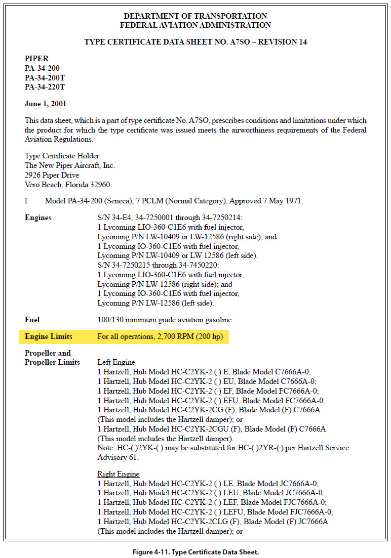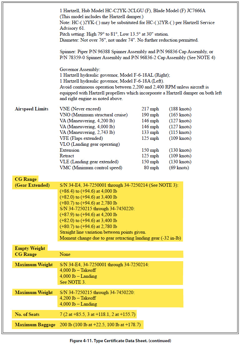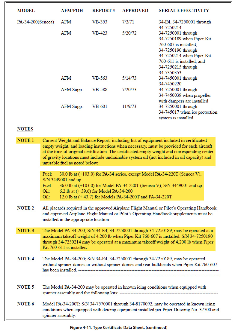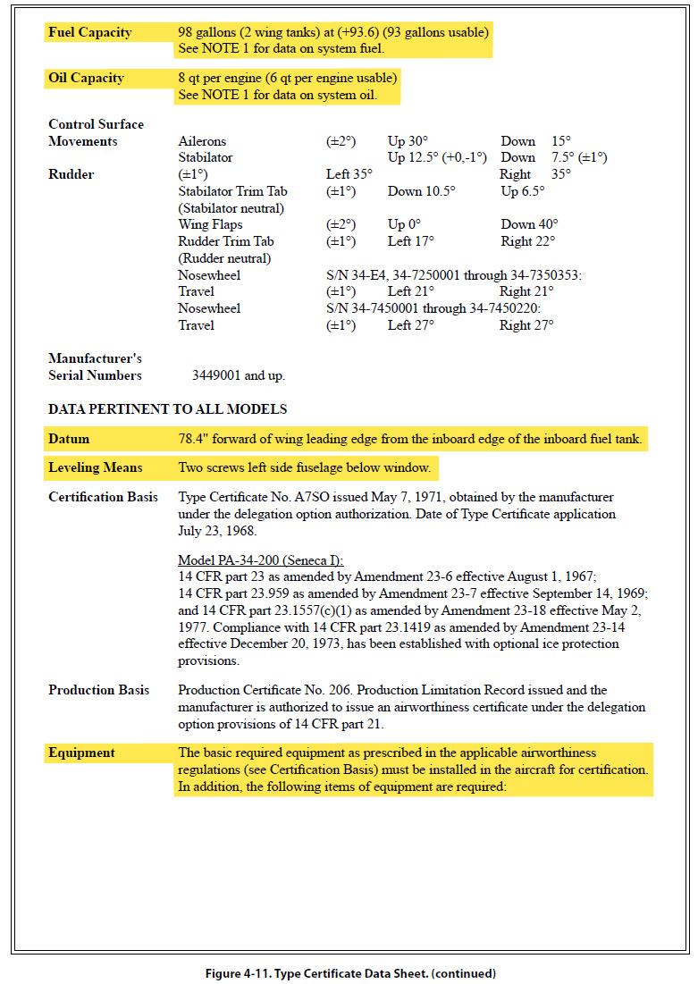The document in Figure 4-11 is a Type Certificate Data Sheet (TCDS) for a Piper twin-engine airplane known as the Seneca (PA-34-200). The main headings for the information typically contained in a TCDS are included, but much of the information contained under these headings has been removed if it did not directly pertain to weight and balance. Information on only one model of Seneca is shown, because to show all the different models would make the document excessively long. The portion of the TCDS that has the most direct application to weight and balance is highlighted in yellow.