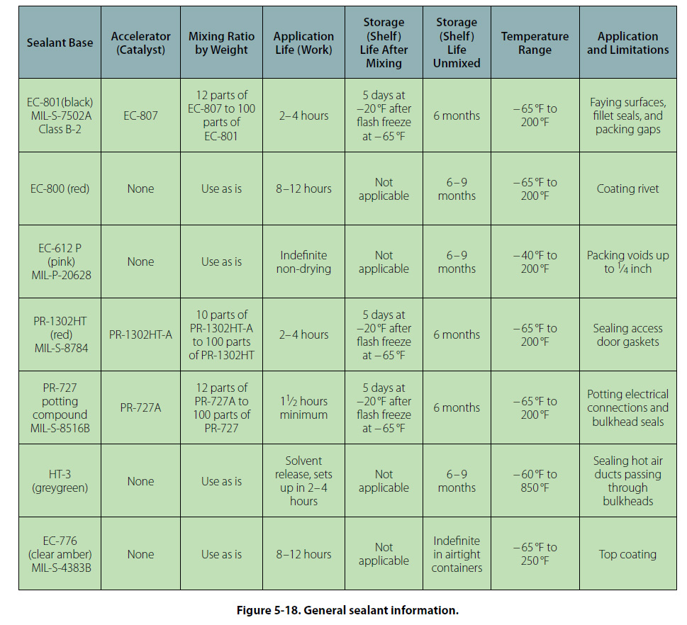 The working life of mixed sealant is from 1/2 hour to 4 hours (depending upon the class of sealant); therefore, apply mixed sealant as soon as possible or place in refrigerated storage. Figure 5-18 presents general information concerning various sealants.
