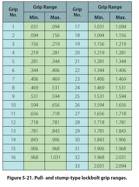 Grip Range. To determine the bolt grip range required for any application, measure the thickness of the material with a hook scale inserted through the hole. Once this measurement is determined, select the correct grip range by referring to the charts provided by the rivet manufacturer. Examples of grip range charts are shown in Figures 5-21 and 5-24.