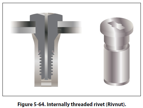 Rivnuts This is the trade name of a hollow, blind rivet made of 6053 aluminum alloy, counterbored and threaded on the inside. Rivnuts can be installed by one person using a special tool which heads the rivet on the blind side of the material. The Rivnut is threaded on the mandrel of the heading tool and inserted in the rivet hole. The heading tool is held at right angles to the material, the handle is squeezed, and the mandrel crank is turned clockwise after each stroke. Continue squeezing the handle and turning the mandrel crank of the heading tool until a solid resistance is felt, which indicates that the rivet is set. The Rivnut is used primarily as a nut plate and in the attachment of deicer boots to the leading edges of wings. It may be used as a rivet in secondary structures or for the attachment of accessories such as brackets, fairings, instruments, or soundproofing materials. Rivnuts are manufactured in two head types, each with two ends: the flathead with open or closed end, and the countersunk head with open or closed end. All Rivnuts, except the thin head countersunk type, are available with or without small projections (keys) attached to the head to keep the Rivnut from turning. Keyed Rivnuts are used as a nut plate, while those without keys are used for straight blind riveting repairs where no torque loads are imposed. A keyway cutter is needed when installing Rivnuts which have keys. The countersunk style Rivnut is made with two different head angles: the 100° with 0.048 and 0.063 inch head thickness, and the 115° with 0.063 inch head thickness. Each of these head styles is made in three sizes: 6-32, 8-32, and 10-32. These numbers represent the machine screw size of the threads on the inside of the Rivnut. The actual outside diameters of the shanks are 3/16 inch for the 6-32 size, 7/32 inch for the 8-32 size, and 1/4 inch for the 10-32 size. Open end Rivnuts are the most widely used and are recommended in preference to the closed end type wherever possible. However, closed end Rivnuts must be used in pressurized compartments. Rivnuts are manufactured in six grip ranges. The minimum grip length is indicated by a plain head, and the next higher grip length by one radial dash mark on the head. Each succeeding grip range is indicated by an additional radial dash mark until five marks indicate the maximum range.