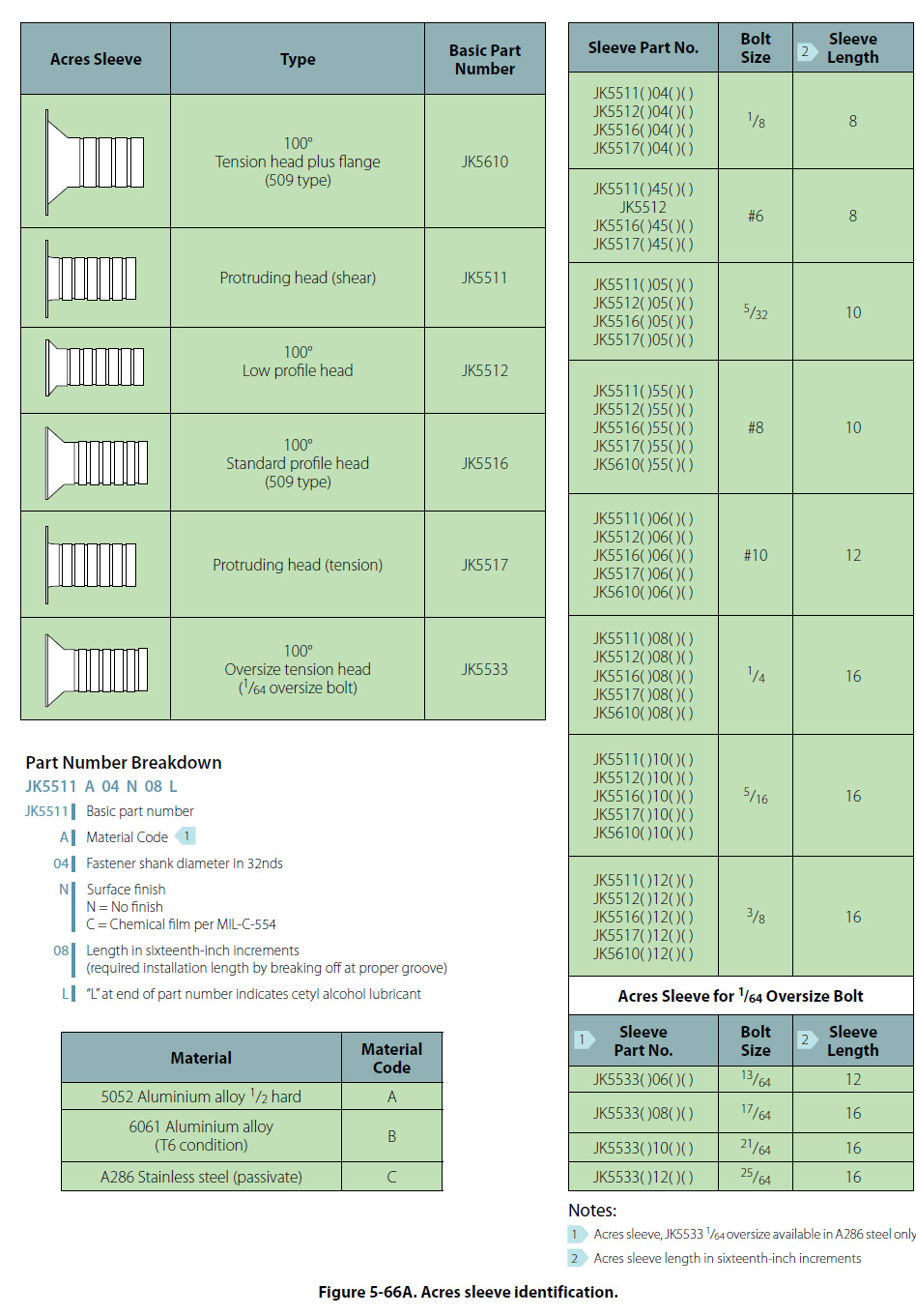The sleeve is identified by a standard code number [Figure 5-66A] which represents the type and style of sleeve, a material code, the fastener shank diameter, surface finish code letter and grip tang for the sleeve.