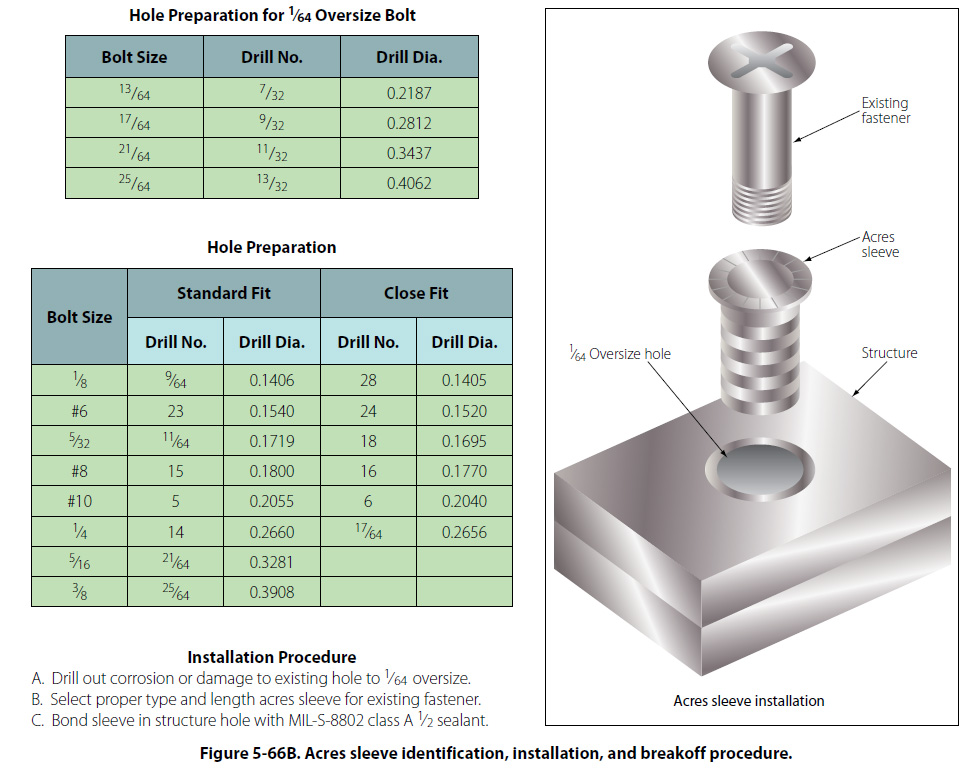 Refer to Figure 5-66B for drill number for standard or close fit holes. Inspect hole after drilling to assure all corrosion is removed before installing the sleeve. The hole must also be the correct shape and free from burrs. The countersink must be enlarged to receive the flare of the sleeve so the sleeve is flush with the surrounding surface.