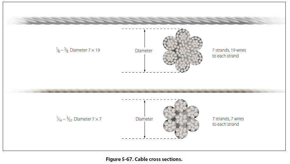 The 7 × 7 cable consists of seven strands of seven wires each. Six of these strands are laid around the center strand. [Figure 5-67] This is a cable of medium flexibility and is used for trim tab controls, engine controls, and indicator controls.