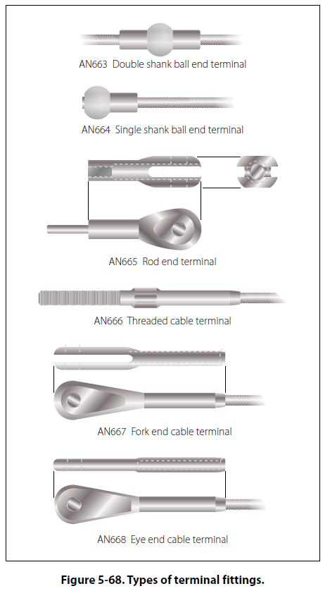 Terminal fittings are generally of the swaged type. They are available in the threaded end, fork end, eye end, single shank ball end, and double shank ball end. The threaded end, fork end, and eye end terminals are used to connect the cable to a turnbuckle, bellcrank, or other linkage in the system. The ball end terminals are used for attaching cables to quadrants and special connections where space is limited. Figure 5-68 illustrates the various types of terminal fittings.