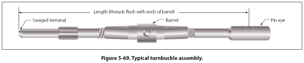 A turnbuckle assembly is a mechanical screw device consisting of two threaded terminals and a threaded barrel. [Figure 5-69]