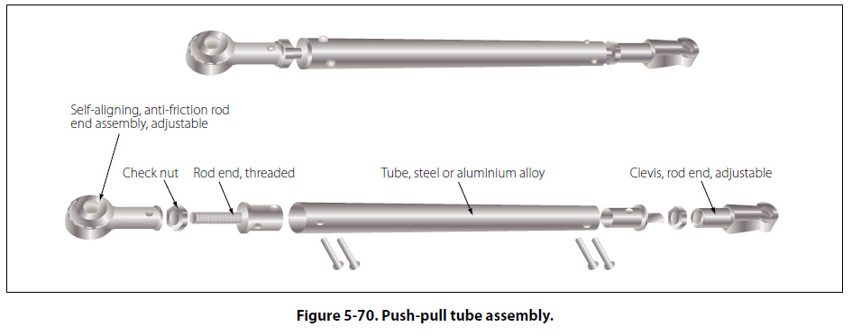 [Figure 5-70] The checknuts secure the end fittings after the tube assembly has been adjusted to its correct length. Push-pull tubes are generally made in short lengths to prevent vibration and bending under compression loads.