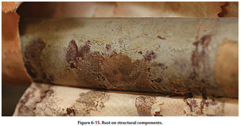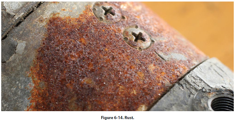 [Figure 6-14] Its presence in these areas is generally not dangerous and has no immediate effect on the structural strength of any major components. The residue from the rust may also contaminate other ferrous components, promoting corrosion of those parts. The rust is indicative of a need for maintenance and of possible corrosive attack in more critical areas. It is also a factor in the general appearance of the equipment. When paint failures occur or mechanical damage exposes highly stressed steel surfaces to the atmosphere, even the smallest amount of rusting is potentially dangerous in these areas and must be removed and controlled. Rust removal from structural components, followed by an inspection and damage assessment, must be done as soon as feasible. [Figure 6-15]