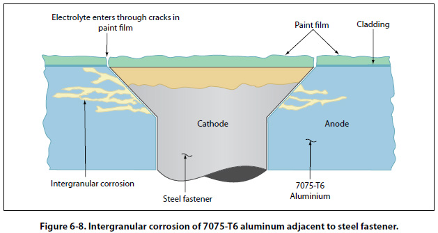 This type of corrosion is an attack along the grain boundaries of an alloy and commonly results from a lack of uniformity in the alloy structure. Aluminum alloys and some stainless steels are particularly susceptible to this form of electrochemical attack. [Figure 6-8] The lack of uniformity is caused by changes that occur in the alloy during heating and cooling during the material’s manufacturing process.