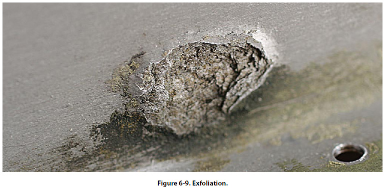 [Figure 6-9] This is a lifting or flaking of the metal at the surface due to delamination of the grain boundaries caused by the pressure of corrosion residual product buildup. This type of corrosion is difficult to detect in its initial stage. Extruded components such as spars can be subject to this type of corrosion. Ultrasonic and eddy current inspection methods are being used with a great deal of success.
