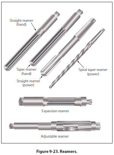 Reamers are used to smooth and enlarge holes to exact size. Hand reamers have square end shanks so that they can be turned with a tap wrench or similar handle. The various types of reamers are illustrated in Figure 9-23.