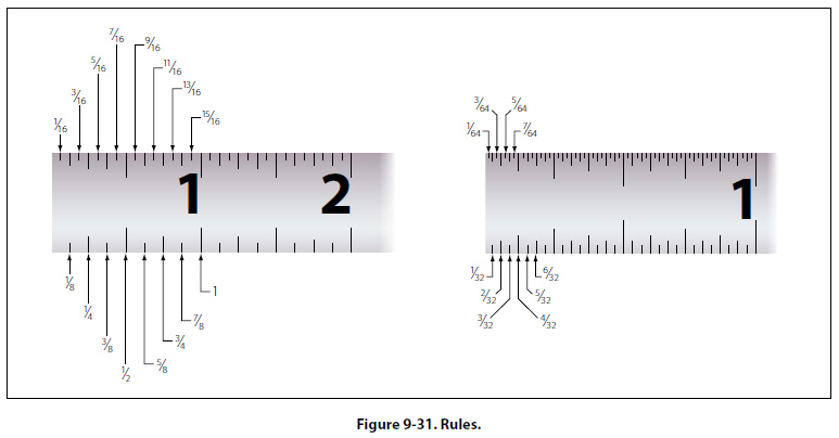Rules are manufactured in two basic styles — those divided or marked in common fractions and those divided or marked in decimals or divisions of one onehundredth of an inch. A rule may be used either as a measuring tool or as a straightedge. [Figure 9-31]