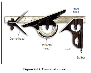 The combination set, as its name implies, is a tool that has several uses. It can be used for the same purposes as an ordinary tri-square, but it differs from the trisquare in that the head slides along the blade and can be clamped at any desired place. Combined with the square or stock head are a level and scriber. The head slides in a central groove on the blade or scale, which can be used separately as a rule. [Figure 9-32]