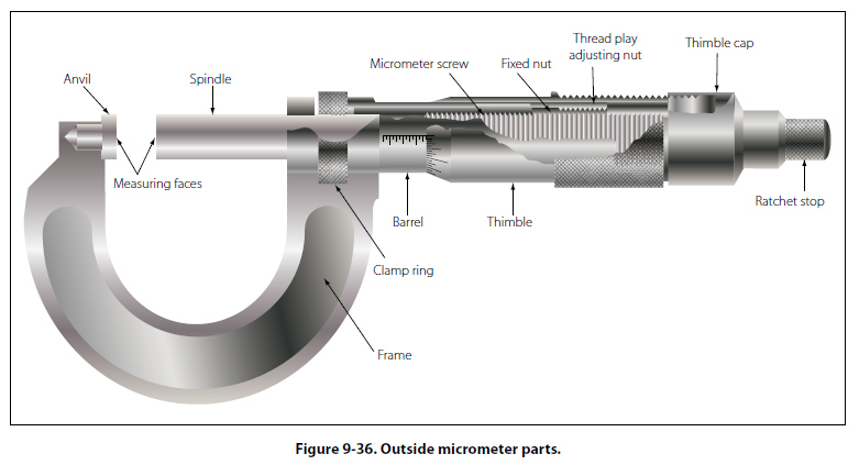 Micrometer Parts The fixed parts of a micrometer are the frame, barrel, and anvil. The movable parts of a micrometer are the thimble and spindle. The thimble rotates the spindle which moves in the threaded portion inside the barrel. Turning the thimble provides an opening between the anvil and the end of the spindle where the work is measured. The size of the work is indicated by the graduations on the barrel and thimble. [Figure 9-36]