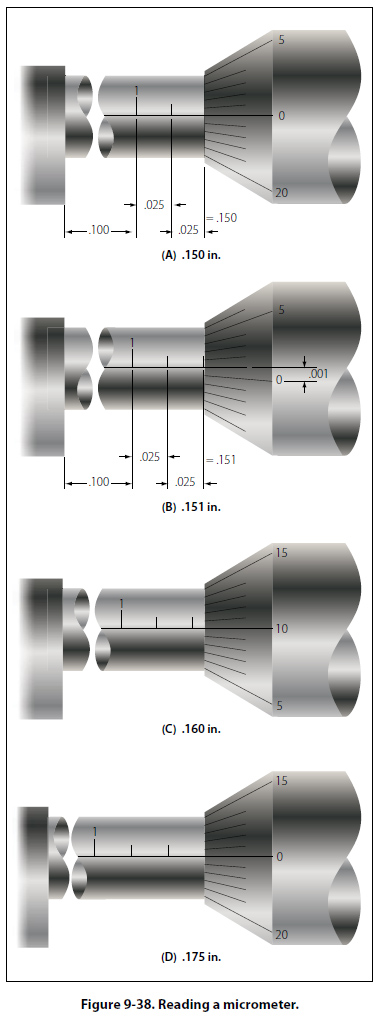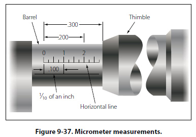 Reading a Micrometer The lines on the barrel marked 1, 2, 3, 4, and so forth, indicate measurements of tenths, or 0.100 inch, 0.200 inch, 0.300 inch, 0.400 inch, respectively. [Figure 9-37]