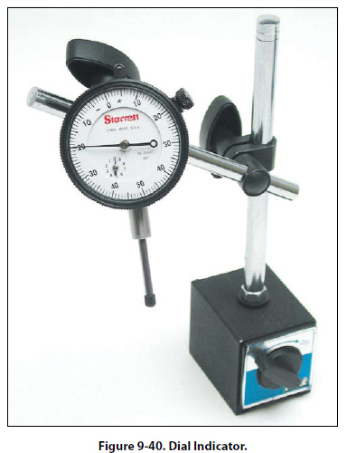 A variation of the micrometer is the dial indicator, which measures variations in a surface by using an accurately machined probe mechanically linked to a circular hand whose movement indicates thousandths of an inch, or is displayed on a liquid crystal display (LCD) screen. [Figure 9-40]