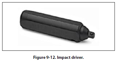 Impact Drivers In certain applications, the use of an impact driver may be required. Struck with a mallet, the impact driver uses cam action to impart a high amount of torque in a sharp impact to break loose a stubborn fastener. The drive portion of the impact driver can accept a number of different drive bits and sockets. The use of special bits and sockets specifically manufactured for use with an impact driver is required. [Figure 9-12]