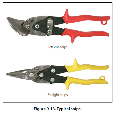 Metal Cutting Tools Hand Snips There are several kinds of hand snips, each of which serves a different purpose. Straight, curved, hawksbill, and aviation snips are in common use. Straight snips are used for cutting straight lines when the distance is not great enough to use a squaring shear and for cutting the outside of a curve. The other types are used for cutting the inside of curves or radii. Snips should never be used to cut heavy sheet metal. [Figure 9-13]