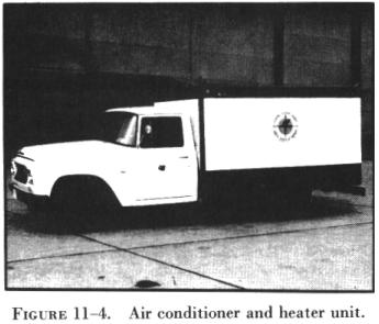 Figure 11-4 shows a typical mobile air conditioner and heating unit. This unit is capable of delivering up to 3,500 cu ft of cooling air per minute. It is capable of dropping the interior temperature of a large aircraft from 115° F to approximately 76° F. Its heating capability provides an output of up to 400,000 Btu per hour. A single engine supplies power to the truck and the air conditioning equipment. This is accomplished by means of power takeoffs mounted on an |