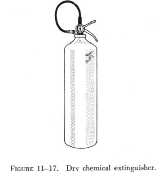 The selection of a fire extinguisher for ground installation, shop, fueling station, etc., is not restricted as it is for airborne installations. The range of selection for agent and type extinguishers is shown in figure 11-11. (See figure 11-16 and figure 11-17). Methods of Extinguisher Operation. The methods of operation of extinguishers are most conveniently arranged by grouping extinguishers according to their expelling means. Six methods are in common use. |