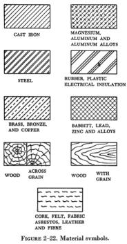 Material Symbols Section line symbols show the kind of material from which the part is to be constructed. The material may not be indicated symbolically when its exact specification must also be shown elsewhere on the drawing. In this case, the more easily drawn symbol for cast iron is used for the sectioning, and the material specification is listed in the bill of materials or indicated in a note. Figure 2-22 illustrates a few standard material symbols. Shape Symbols |
