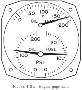 The fuel pressure gauge indicates the pressure of the fuel entering the carburetor. This gauge may be included with the oil pressure gauge and the oil temperature gauge in one casing, called the engine gauge unit. Most aircraft today have separate gauges for these functions. An engine gauge unit is shown in figure 4-21.