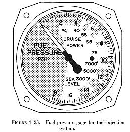 A fuel pressure gauge often used with fuel injection systems on light aircraft engines is illustrated in figure 4-23. A gauge of this type registers metered fuel pressure at the fuel injection unit distributor valve and is a direct indication of engine power output when installed in a fuel injection system for light aircraft engines. The dial of the gauge is marked to indicate percent of power. The gauge does not indicate either the engine driven pump or the boost pump pressure.