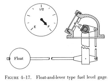 The mechanical-type fuel quantity gauge is usually located in the tank and is known as a direct reading gauge. It has an indicator connected to a float resting on the surface of the fuel. As the fuel level changes, the float mechanically operates the indicator, thus showing the level of fuel in the tank. One type of mechanical fuel gauge is illustrated in figure 4-17.