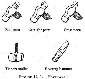 Occasionally it is necessary to use a soft faced hammer, which has a striking surface made of wood, brass, lead, rawhide, hard rubber, or plastic. These hammers are intended for use in forming soft metals and striking surfaces that are easily damaged. Soft faced hammers should not be used for rough work. Striking punch heads, bolts, or nails will quickly ruin this type hammer. A mallet is a hammerlike tool with a head made of hickory, rawhide, or rubber. It is handy for shaping thin metal parts without denting them. Always use a wooden mallet when pounding a wood chisel or a gouge. |