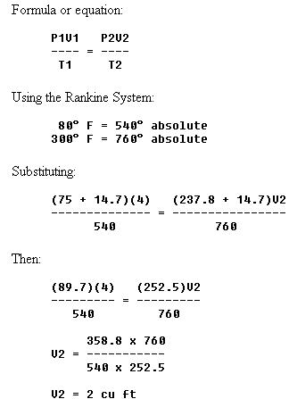 2. Four cubic feet of a gas at 75 psig and 80° F are compressed to 237.8 psig and heated to a temperature of 300° F. What is the volume of the gas resulting from these changes?