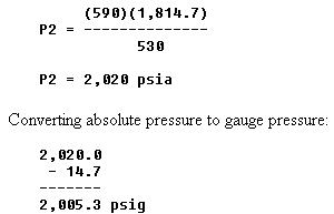 This equation means that with a constant volume, the absolute pressure of a gas varies directly with the absolute temperature. Examples of Charles' law: A cylinder of gas under a pressure of 1,800 psig at 70° F is left out in the sun in the tropics and heats up to a temperature of 130° F. What is the new pressure within the cylinder? The pressure and temperature must be converted to absolute pressure and temperature. Formula or equation: