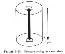 Therefore, the liquid remains at rest; it does not leak out and the tank does not collapse. One of the consequences of Pascal's law is that the shape of the container in no way alters pressure relations. Thus, in figure 7-11, if the pressure due to the weight of the liquid at one point on the horizontal line (H) is 8 psi, the pressure is 8 psi everywhere at level (H) in the system. Pressure due to the weight of a fluid depends, at any level, on the height of the fluid from the level to the surface of the fluid. The vertical distance between two horizontal levels in a fluid is known as the head of the fluid. In figure 7-11, the liquid head of all points on level (H) with respect to the surface is indicated. Pressure due to fluid head also depends on the density of the fluid. Water, for example, weighs 62.4 lbs/cu ft or 0.036 lb/cu in, but a certain oil might weigh 55 lbs/cu ft, or 0.032 lb/cu in. To produce a pressure of 8 psi, it would take 222 inches of head using water, and 252 inches of head using the oil (see figure 7-12). Force and Pressure In order to understand how Pascal's law is applied to fluid power, a distinction must be made between the terms "force" and "pressure." Force may be defined as a push or pull. It is the push or pull exerted against the total area of a particular surface and is expressed in pounds. As previously stated, pressure is the amount of force on a unit area of the surface acted upon. In hydraulics and pneumatics, pressure is expressed in pounds per square inch. Thus, pressure is the amount of force acting upon 1 square inch of area. Computing Force, Pressure, and Area A formula, similar to those used with the gas laws, is used in computing force, pressure, and area in fluid power systems. Although there appears to be three formulas, it is only one formula written in three variations, where P refers to pressure, F indicates force, and A represents area. Force equals pressure times area. Thus, the formula is written: F = P x A Pressure equals force divided by the area. By rearranging the formula, this statement is condensed into: