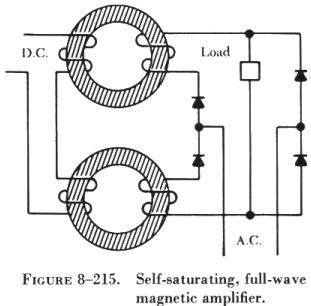 In order to use the full ac input power, a circuit such as that shown in figure 8-215 may be used. This circuit uses a fullwave bridge rectifier. The load will receive a controlled direct current by using the full ac input. This type of circuit is known as a selfsaturating, fullwave magnetic amplifier.