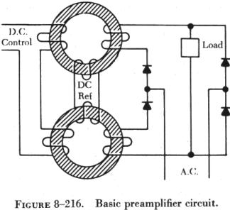 In figure 8-216 it is assumed that the dc control winding is supplied by a variable source, such as a sensing circuit. In order to control such a source and use its variations to control the ac output, it is necessary to include another dc winding that has a constant value. This winding, referred to as the reference winding, magnetizes the magnetic core in one direction.