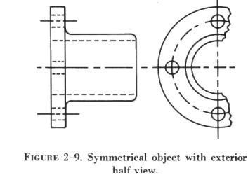 When space is limited and two views must be shown, symmetrical objects are often represented by half views, as illustrated in figure 2-9.
