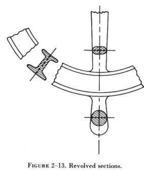 A revolved section drawn directly on the exterior view shows the shape of the cross section of a part, such as the spoke of a wheel. An example of a revolved section is shown in figure 2-13.