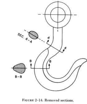 Figure 2-14 is an illustration of removed sections. Section A-A shows the cross-sectional shape of the object at cutting plane line A-A. Section B-B shows the cross-sectional shape at cutting plane line B-B. These sectional views are drawn to the same scale as the principal view; however, as already mentioned, they are often drawn to a larger scale to bring out pertinent details.