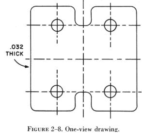One view drawings are commonly used for objects of uniform thickness, such as gaskets, shims, and plates. A dimensional note gives the thickness as shown in figure 2-8. One view drawings are also commonly used for cylindrical, spherical, or square parts if all the necessary dimensions can be properly shown in one view.