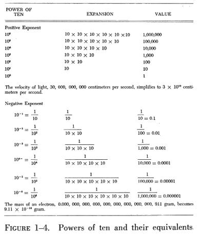 The difficulty of performing mathematical problems with very large (or very small) numbers and the counting and writing of many decimal places are both an annoyance and a source of error. The problems of representation and calculation are simplified by the use, of "powers of ten." (See figure 1-4.). This system, sometimes referred to as "Engineer's Shorthand," requires an understanding of the principles of the exponent. These are summarized as follows: