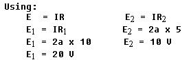 Since there are two resistances in the circuit, there will be two separate voltage drops. These two voltage drops will be the loss in electrical pressure used to force electrons through the resistances. The amount of electrical pressure required to force a given number of electrons through a resistance is proportional to the size of the resistance. Thus, the voltage drop across R1 will be twice that across R2 since R1 has two times the resistance value of R2. The drop across R1 is labeled E1, and that across R2 is E2. The current, I, is the same throughout the circuit. |