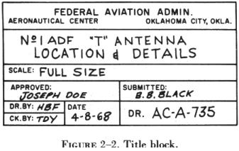 Every print must have some means of identification. This is provided by a title block (see figure 2-2). The title block consists of a drawing number and certain other data concerning the drawing and the object it represents. This information is grouped in a prominent place on the print, usually in the lower right-hand corner. Sometimes the title block is in the form of a strip extending almost the entire distance across the bottom of the sheet.