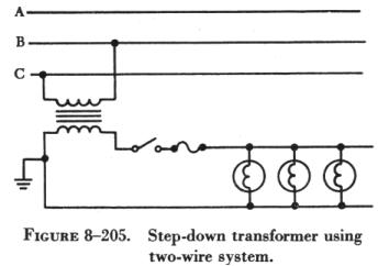 In combination, all four wires can furnish power at 208 volts, three phase, for operating three phase equipment, such as three phase motors or rectifiers. When only three phase equipment is used, the ground wire may be omitted. This leaves a three phase, three wire system as illustrated in figure 8-208.