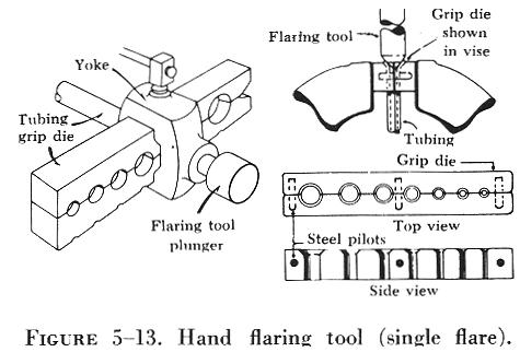 A hand flaring tool similar to that shown in figure 5-13 is used for flaring tubing. The tool consists of a flaring block or grip die, a yoke, and a flaring pin. The flaring block is a hinged double bar with holes corresponding to various sizes of tubing. These holes are countersunk on one end to form the outside support against which the flare is formed. The yoke is used to center the flaring pin over the end of the tube to be flared.